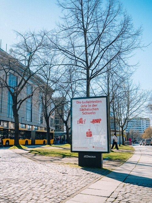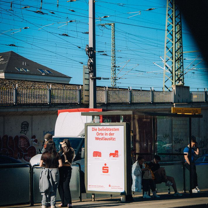 We worked in two phases – first understand, then create. Eight qualitative expert interviews and a quantitative survey conducted with our co-creators at Civey provided clear insights. The Sparkasse is deeply rooted in the region – not only through local sponsorships, but especially through approachable, personal advisory services in numerous branches and through a comprehensive ATM network. From this, we jointly developed the core idea “So beliebt, so vertraut, so selbstverständlich.” (So popular, so familiar, so natural.) along with two creative lines. The first line used stylized icons from landmarks across the eight business regions, such as the Frauenkirche for Dresden, the Bastei for Saxon Switzerland, and St. Marienstern Monastery for West Lusatia. The second line focused on USP-driven motifs highlighting branches, ATMs, mobile payment, and security. The distinctive element was the clean campaign design – typography and icons only, in Sparkasse red. In addition, we produced in-house photo and video content featuring OSD employees to create a “I know them from the poster” effect.