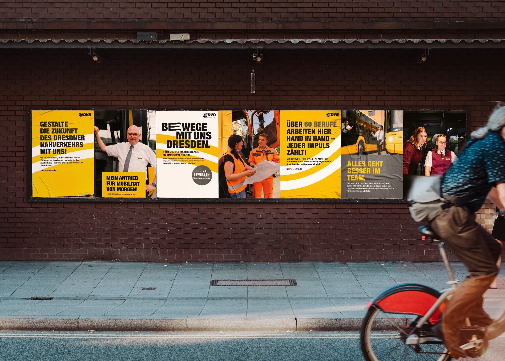 Völlig neuer Arbeitgeber-Auftritt, der Aufmerksamkeit anzieht und die DVB als zukunftsrelevanten, vielfältigen Arbeitgeber mit Leidenschaft zeigt. Einblicke in spannende Arbeitswelten, echte Mitarbeitenden-Stories und deren Motivation für ihre wichtige Mission in Dresden. Der neue Messestand bei der Karrierestartmesse? Ein echter Hingucker für die junge Zielgruppe. Dazu eine komplett neue Karrierewebsite mit Web-System-Anbindung ans HR-Backend, CD-Manual und Merchandise von Schlüsselanhängern bis Popcorn-Bechern. Mission accomplished: Eine Employer Brand, die innen hält, was sie außen verspricht. Straßenbahn-Power pur!