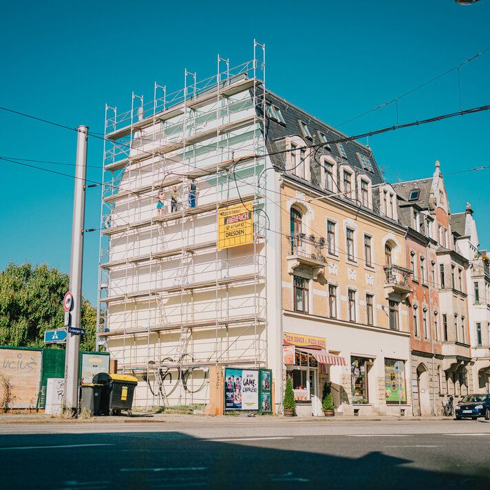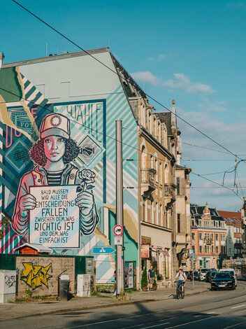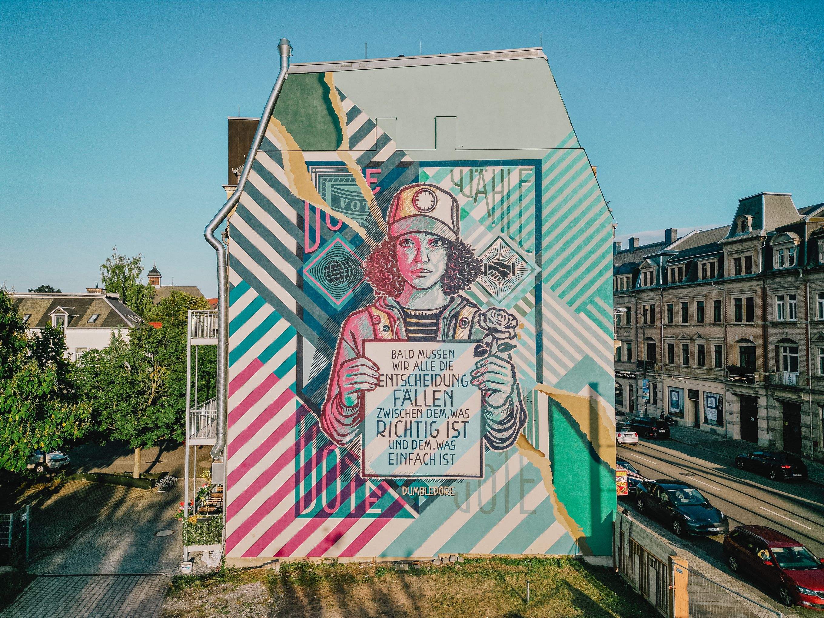 Gut zwei Wochen, dann war das Motiv an der neuen Wand an der Leipziger Str. 232 in Dresden fertig. Das 13 x 17 Meter große Motiv wurde von einem internationalen Künstlerkollektiv aus Deutschland, Polen, der Ukraine und Russland gestaltet und ist nach wie vor noch an der Fassade zu sehen.
