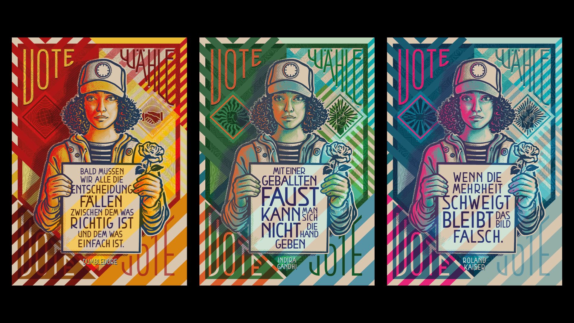 Nach fruchtbaren Gesprächen entstand die Idee, das Motiv aus 2019 weiterzuentwickeln. Das Kind vom 2019er Motiv ist nun älter. Schaut direkt zu dir und hält einen deutlich lesbaren Spruch klar in der Hand.