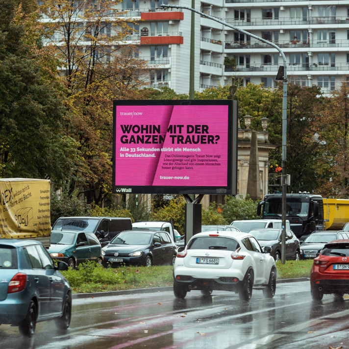 Wie sieht so eine Kampagne aus? Dunkel? Nö. Uns war es wichtig, die Stories rund um Trauer in den Alltag zu platzieren. Pink als Farbe gibt hier der Kampagne daher Lautstärke und eine frische Optik. Das Keyvisual ist ein Querstrich. Er steht für einen Bruch im Inneren, den Trauer erst hervorbringt, der langsam heilen muss.