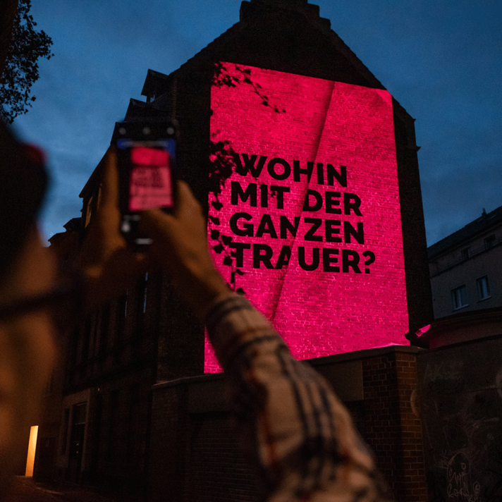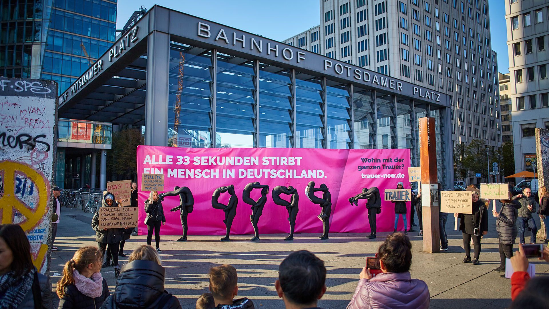 Mit einem Stunt brachten wir das Magazin auf die große Bühne. In Berlin, konnte man zusehen, wie die menschliche Sterbeuhr als medienwirksame Kunstaktion von Akrobaten alle 33 Sekunden eine neue Zahl bildete. Begleitet wurde die menschliche Sterbeuhr lautstark von einer Demo, die das Recht zu Trauern einforderte. Abgerundet wurde die Kampagne durch eine deutschlandweite Schaltung von Plakaten und digitalen Citylight-Postern im Herzen Berlins. Ein weiteres visuelles Highlight waren die Guerilla-Projektionen der digitalen Sterbeuhr auf Häuserfassaden in Berlin, Köln, München, Hamburg und Frankfurt.